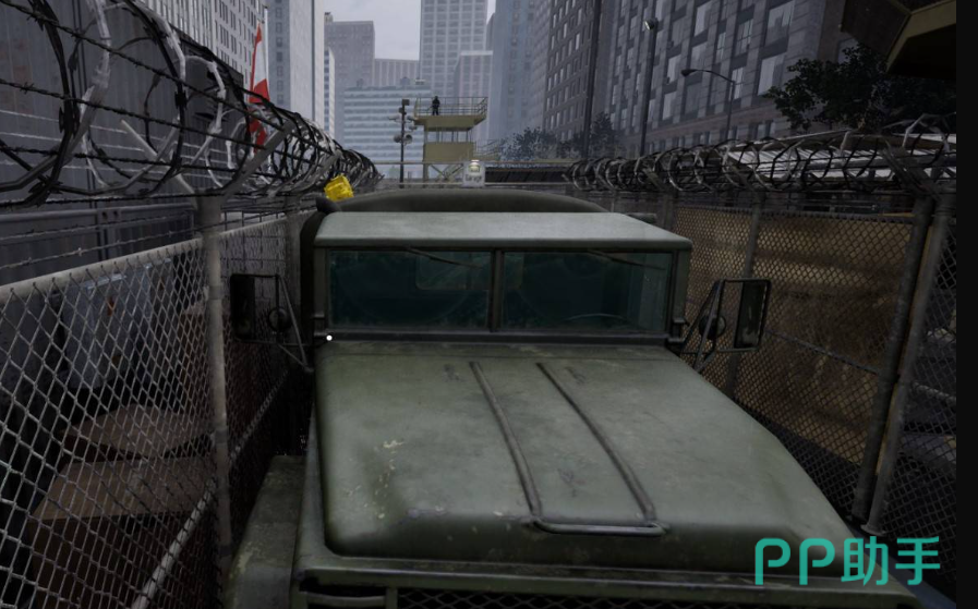 4、迷你金色卡车:切换至车库场景,锁定绿色军用卡车。攀爬至车辆边缘顶部,靠近铁丝网一侧的车顶表面,即可发现该金色模型。
