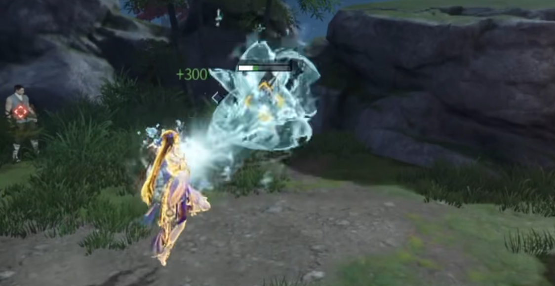 二技能“傩舞·振”为突进型压制技:向前疾冲可打断敌方普通攻击与部分蓄力招式,期间处于蓝霸体状态,免疫多数武器打击;若冲刺中被蓝霸体攻击命中,则立即触发处决效果,对目标附加持续灼伤,同时恢复自身少量体力;灼伤效果按当前生命值百分比持续扣除体力,并使目标体力回复效率降低50%。