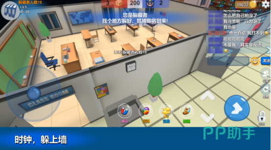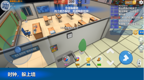 基于经典捉迷藏机制深度拓展,支持5至20人同场竞技。系统自动划分追捕者与躲藏者阵营,躲藏方可在24张主题地图中自由变形——从日常办公区、校园教室,到科幻感十足的航天基地、军事要塞,每张地图均具备可交互元素与视觉伪装逻辑。采用3D建模呈现真实空间感,联网匹配流畅,强调观察力、应变力与环境利用能力。
