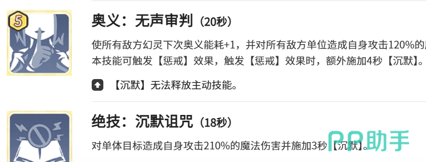 在输出层面,奥法拥有两套差异化控制体系。主动技能【无声审判】冷却时间为20秒,可对全体敌方单位造成120%攻击值的魔法伤害,并额外使其奥义能耗+1,实现范围性节奏打断;若满足触发条件,还将追加4秒群体沉默,瞬间瓦解敌方技能链。另一技能【沉默诅咒】冷却18秒,专注单体打击,造成210%攻击值魔法伤害并附带3秒沉默,适用于关键目标定点清除。