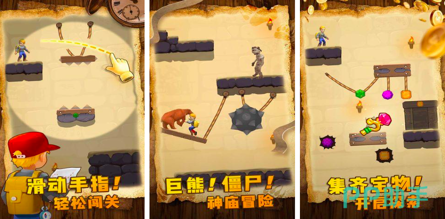 探索神秘古迹,揭开神庙深处的未知谜团。玩家需精准操控绳索切割时机,引导角色触发机关、规避僵尸与巨熊等守卫生物,完成宝藏搜集任务。全作包含100余道高难度割绳关卡及80多个趣味宝箱,资源获取无次数限制;新手友好,内置八种主题道具辅助通关,降低入门门槛。