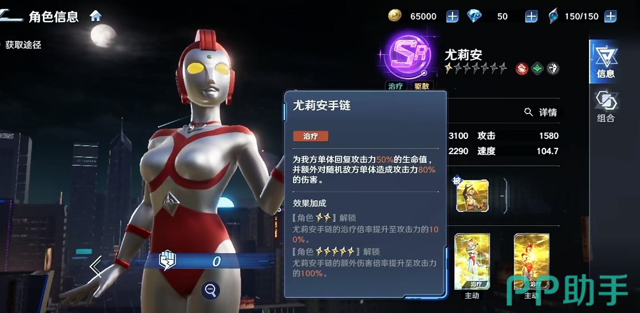 两个主动技能分别覆盖单体与群体维度:一者为指定友方单位回复生命并随机对一名敌方造成伤害;另一者则为全体友方恢复生命,并额外为每位目标驱散一个已有的减益状态。这种兼具治疗、驱散与干扰能力的复合型设计,使尤莉安在多种战斗场景下均能发挥关键作用。