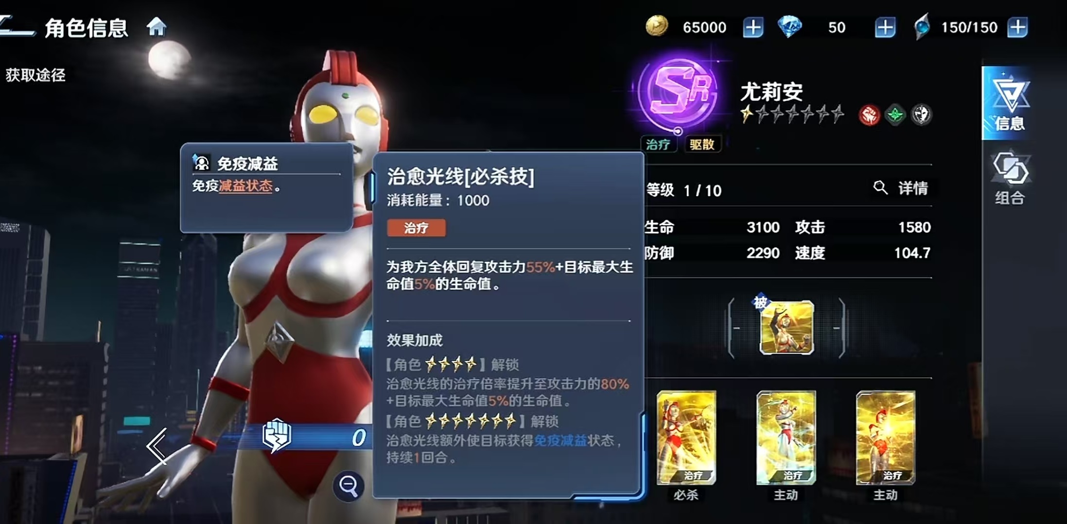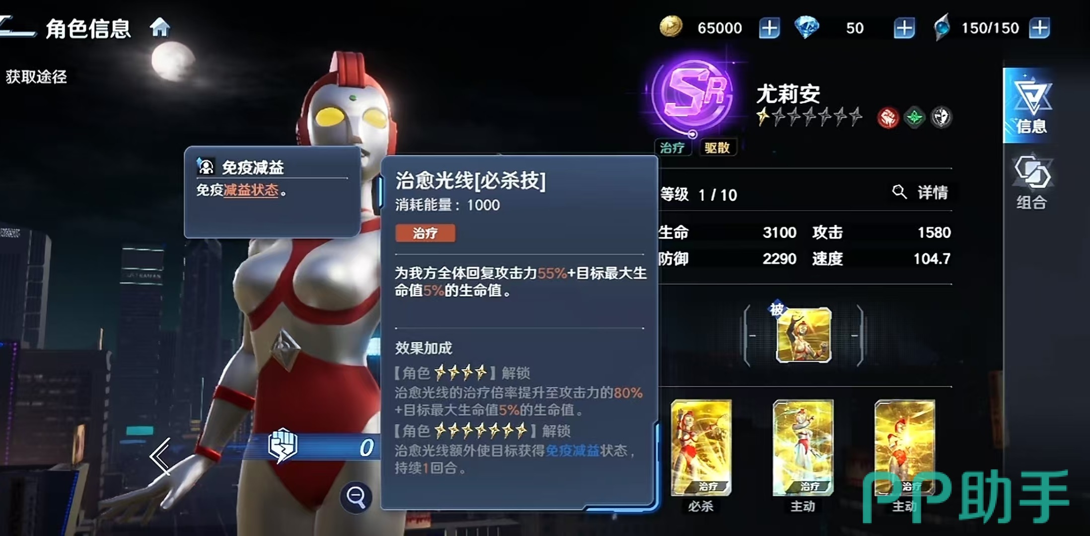 尤莉安的必杀技“治愈光线”为全体友方单位恢复生命值,治疗量基于自身攻击力与目标最大生命值双重计算。通过升星培养,最高可提升80%攻击力加成,并增强5%基于目标最大生命值的治疗效果;此外,该技能还能赋予全体队友免疫减益状态效果,在面对高频施加燃烧、麻痹、沉默等异常状态的敌方阵容时,具有极强的战术反制能力。