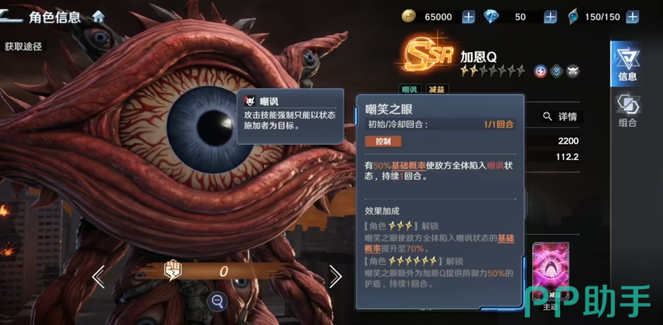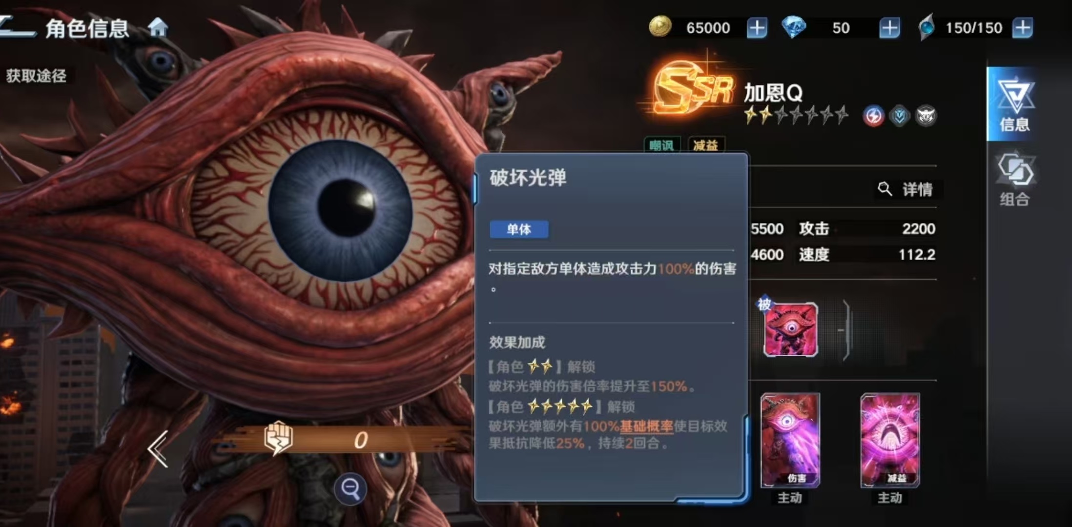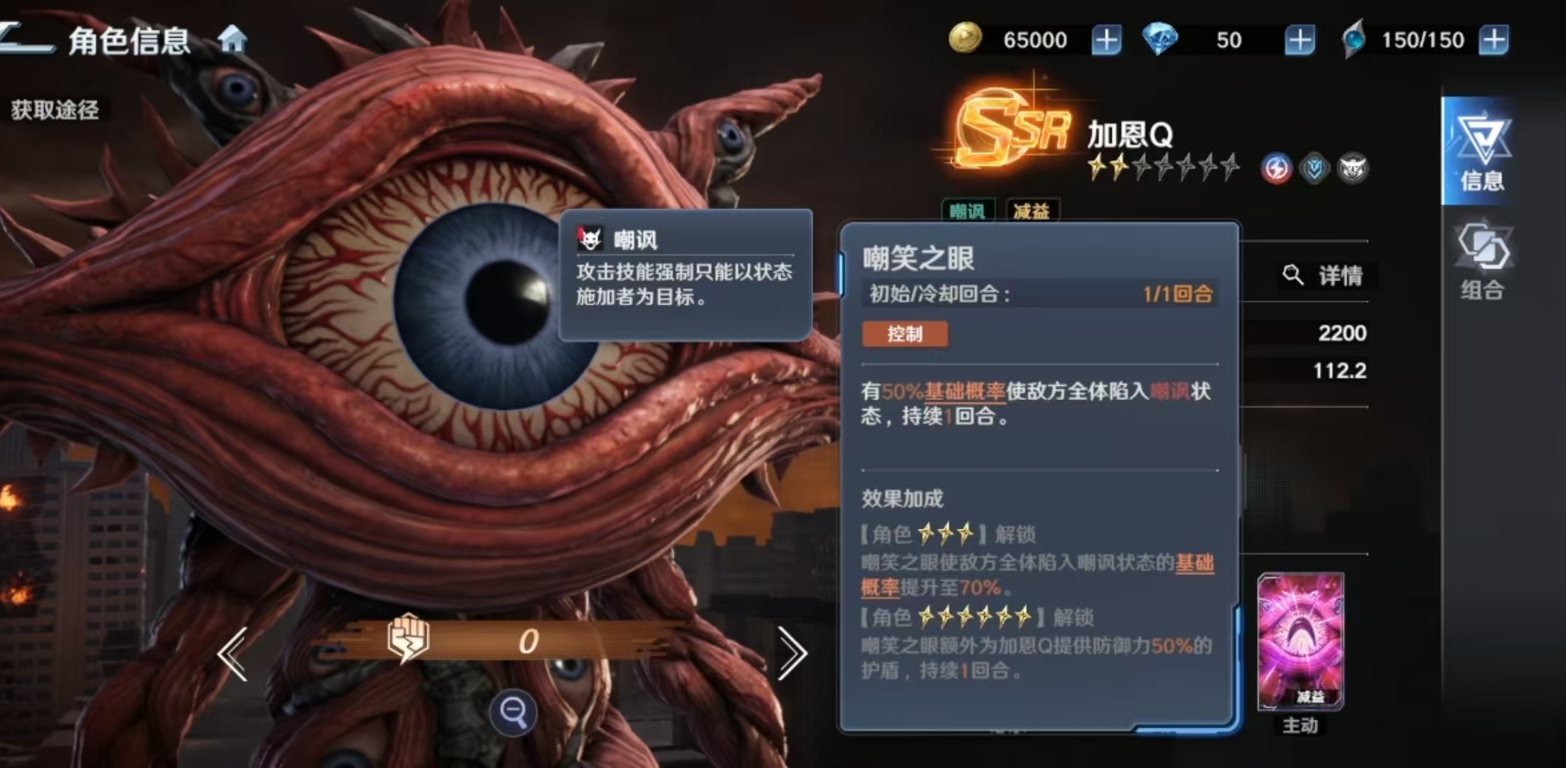 其必杀技“吸收光线”为单体高伤技能,命中后附带“迷茫”状态,使目标跳过下回合行动,并在其行动阶段开始时承受等同于自身攻击力100%的追加伤害。该效果兼具硬控与反伤双重价值,但受限于单体目标与概率触发机制,适用场景相对聚焦。一技能“破坏光弹”除基础单体输出外,还可降低目标效果抵抗值,显著提升队伍整体异常状态命中率。三技能“嘲笑之眼”则提供群体嘲讽能力,初始概率随星级提升最高可达70%,同时为自身附加护盾,强化生存续航能力。