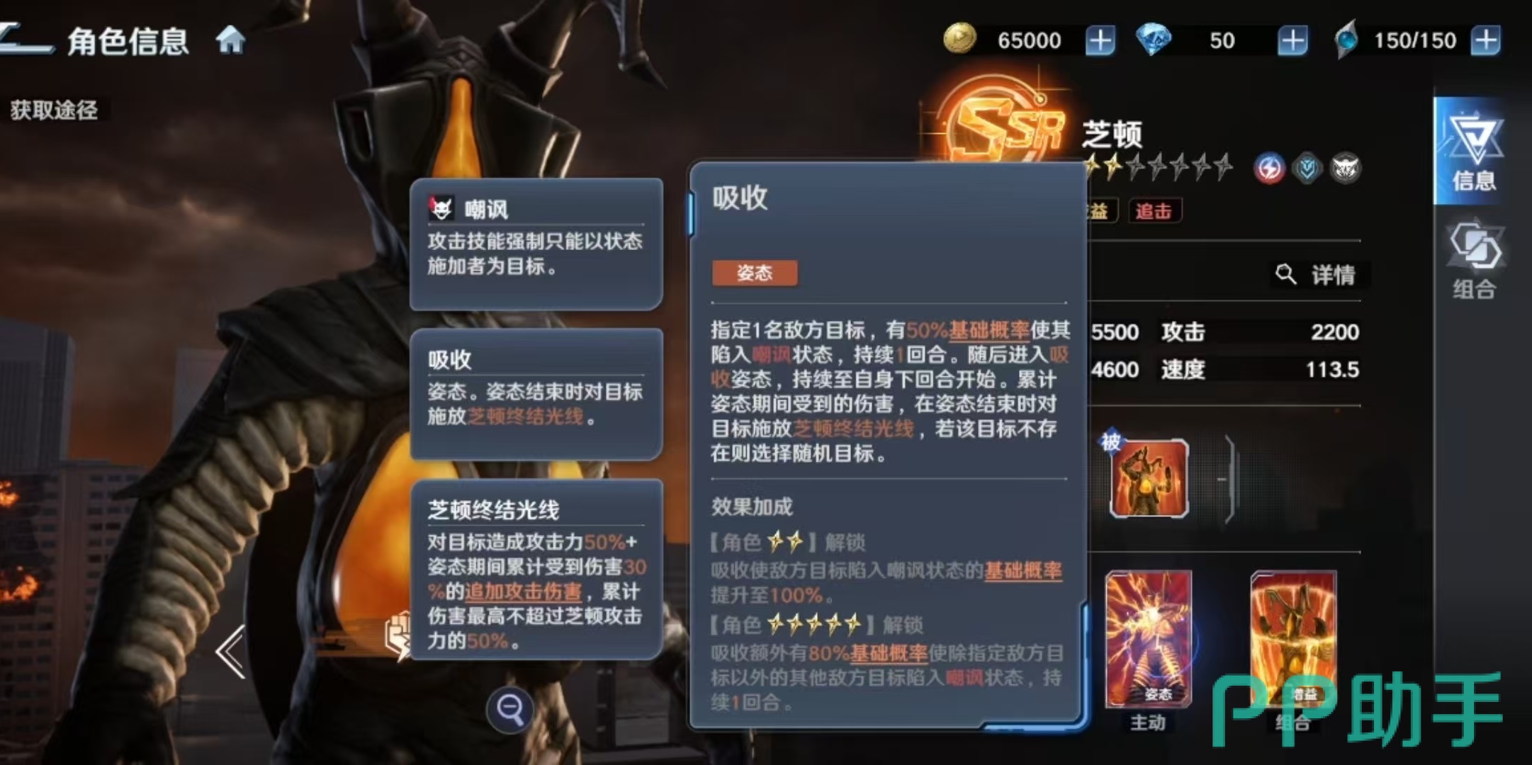 核心技能【嘲讽·吸收终结】是其战术枢纽:选定一名敌方单位强制嘲讽,自身进入伤害吸收状态;状态结束后,将累计所受伤害以终结光线形式全额反弹。该技能兼具控场、保护与反打三重功能,尤其适用于限制敌方高爆发输出角色,是开荒期与日常推图中稳定战线的关键支点。