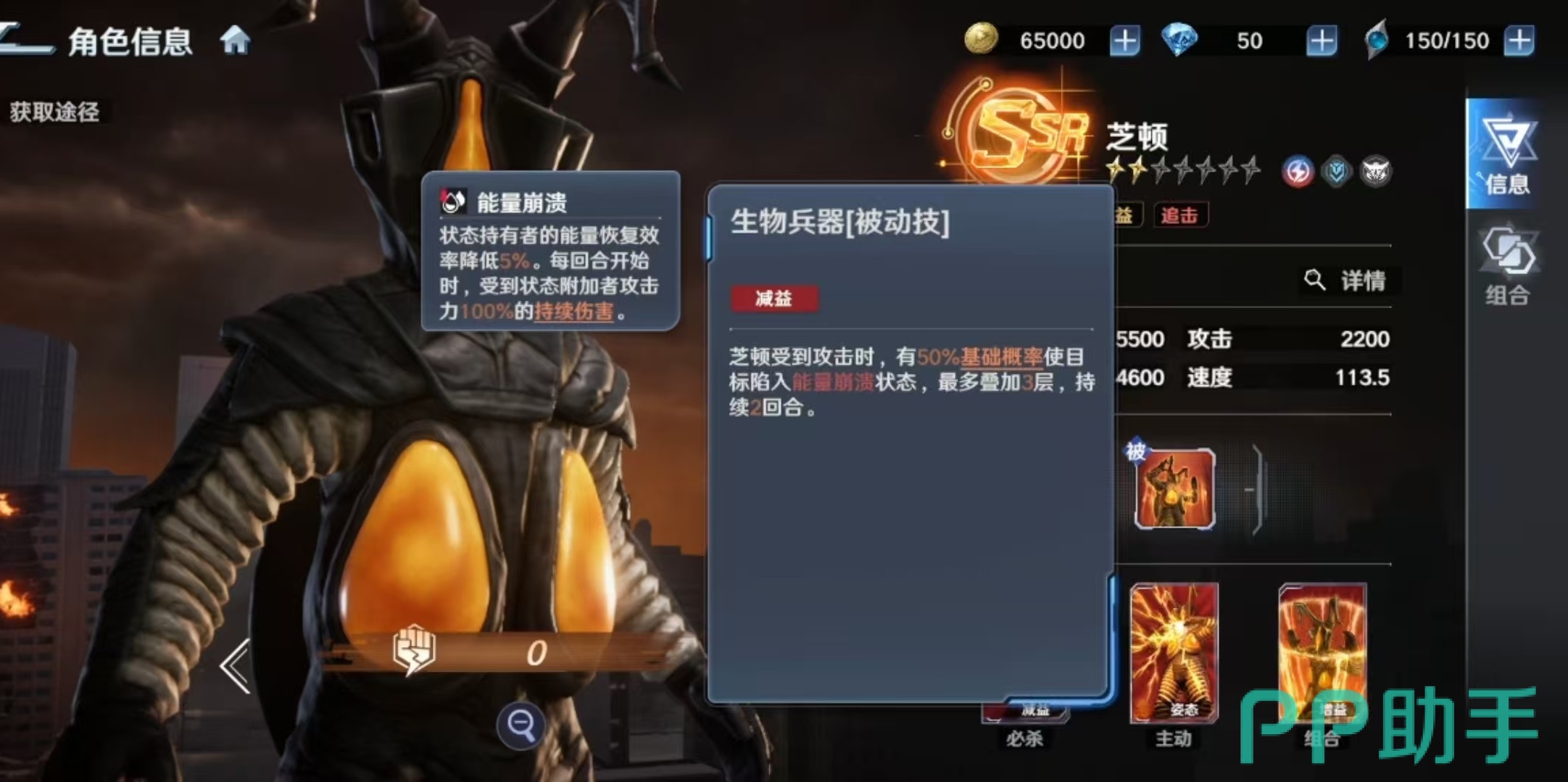 被动技【生物兵器】赋予其独特的反制逻辑:每次受击均有概率触发“能量崩溃”,该状态最多叠加至三层,每层均降低目标能量恢复效率;且每回合初额外施加固定数值的持续伤害。该机制不依赖高额直伤,却能实质性拖慢敌方技能循环节奏,使其在持久战中持续放大团队优势。