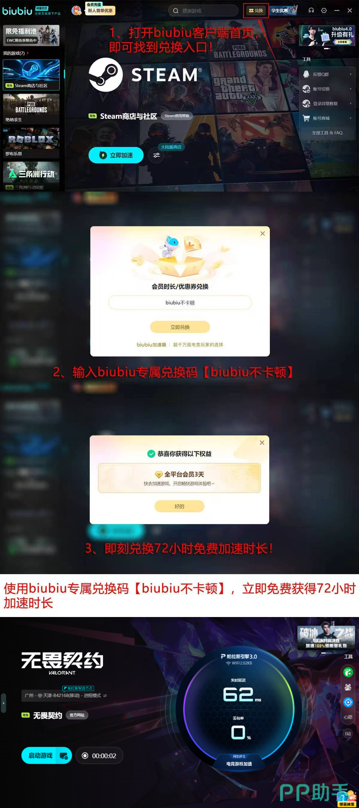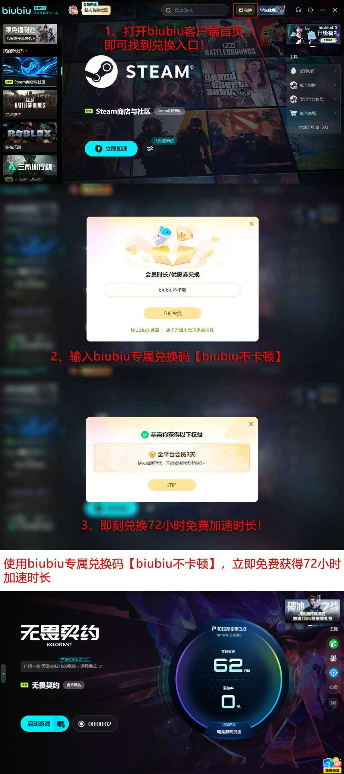新用户注册即可领取24小时全功能加速时长,输入专属口令【biubiu不卡顿】,额外激活72小时连续使用权,累计享96小时深度体验机会。该周期足以覆盖多场高强度排位对局,直观验证延迟压制效果、技能同步改善及移动瞄准流畅度提升等核心指标。