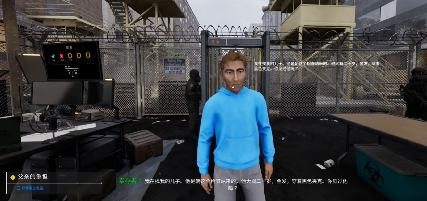 当末世危机全面爆发,人类文明退守至最后的安全区。作为安全区检疫系统的执行者,玩家肩负着至关重要的筛选职责——所有抵达的幸存者必须经过严格医学筛查,仅允许健康个体进入生活区。在这一日常流程中,“检疫区最后一站:父亲的重担”是一项极具叙事深度与道德张力的关键任务。若尚未掌握其完整触发逻辑与分支走向,本文将为你系统梳理全流程要点,助你精准推进、完整体验该任务的多重结局。