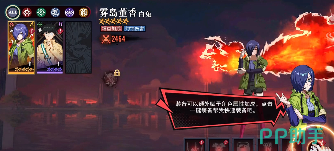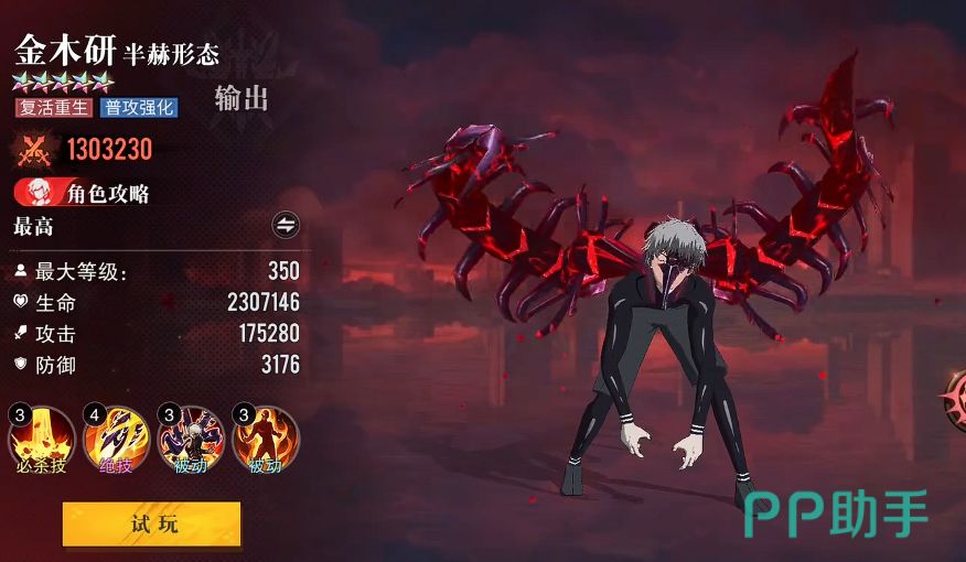 首位推荐的是主角金木研。其机制具备高度泛用性:被动技能可随伤害命中持续吸血,显著提升单体生存与续航能力;小技能覆盖全体敌方单位,兼具AOE清场效率;大招激活后进入强化状态,每次攻击额外附加目标当前生命值百分比伤害,在面对高血量Boss或精英怪时优势尤为明显。作为开荒期最均衡的主输出位,金木研几乎无明显短板,资源倾斜优先级最高。