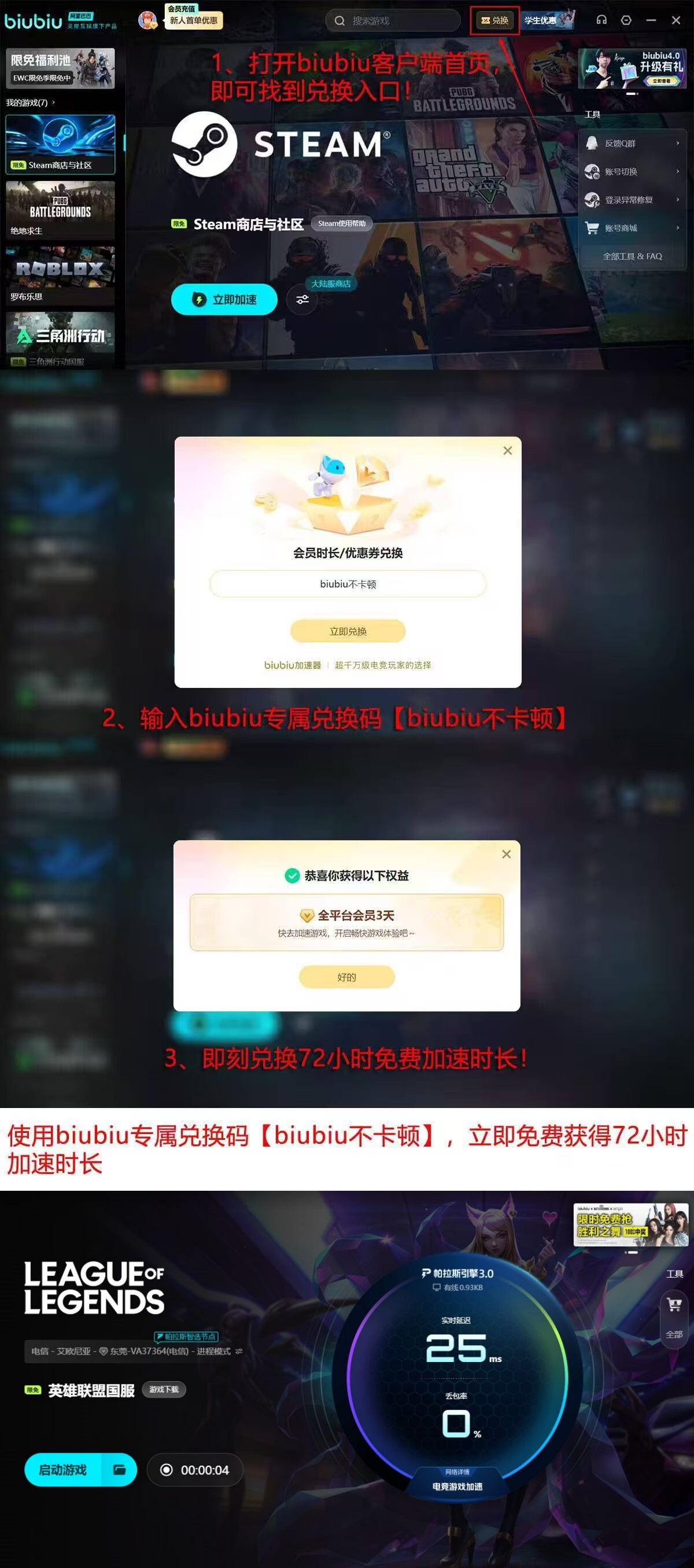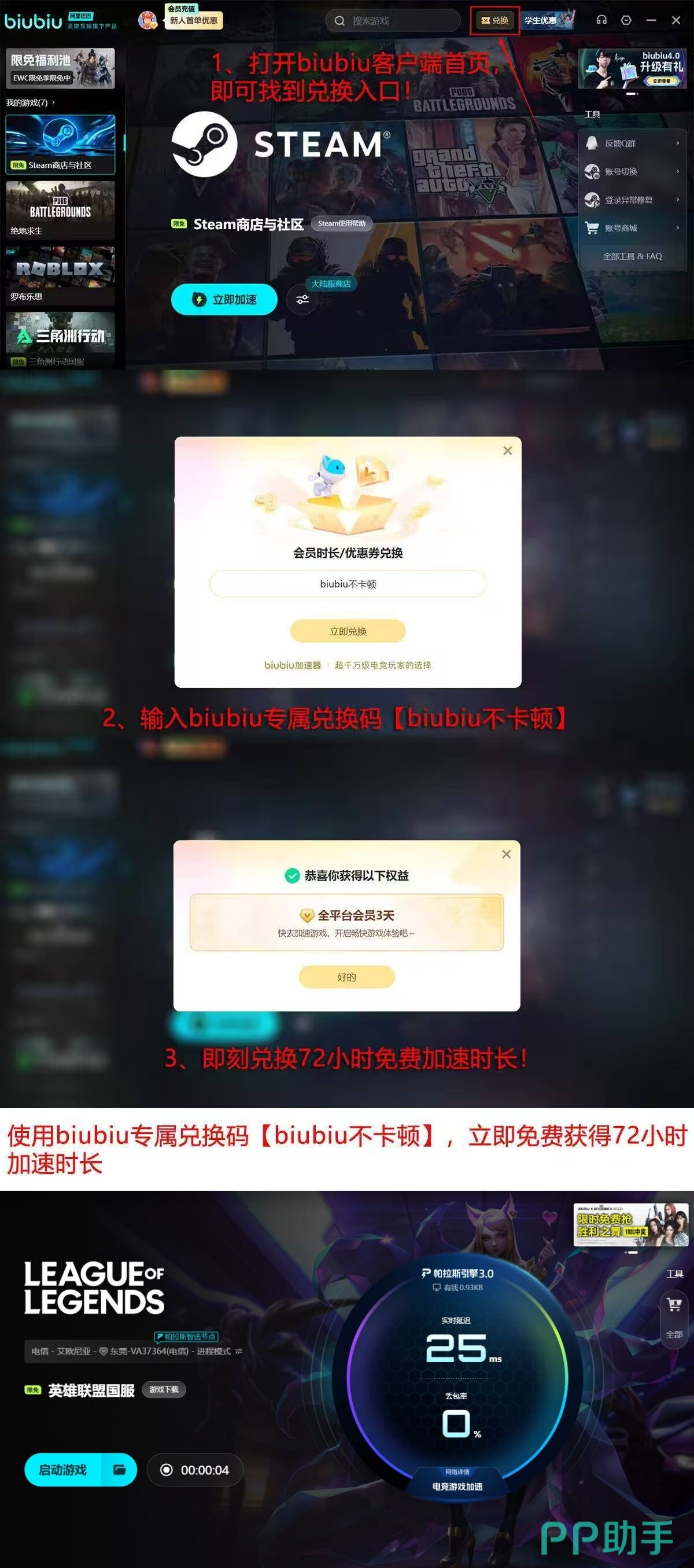 针对新用户,平台同步推出低门槛体验方案:完成首次注册即可获赠24小时全功能试用权益,无任何隐性扣费或绑定要求;进入兑换中心后,所有用户(含新老)输入口令【biubiu不卡顿】,均可领取3天限免会员权限,覆盖平台所支持的全部游戏列表。每位账号限领一次,名额有限,先兑先得。