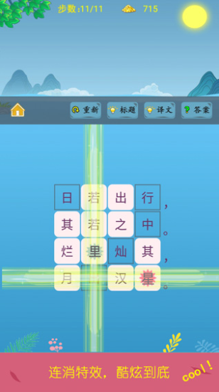 以“诗词拼图”为核心机制,内置从《静夜思》到《赤壁赋》的完整梯度语料库。玩家需从动态字池中筛选字符,依据格律要求(平仄、对仗)、意象逻辑(时间/空间/情感线索)及上下文提示,逐字构建完整诗句。过程可视化呈现诗词结构之美,同步提升文本解构与创造性重构能力。