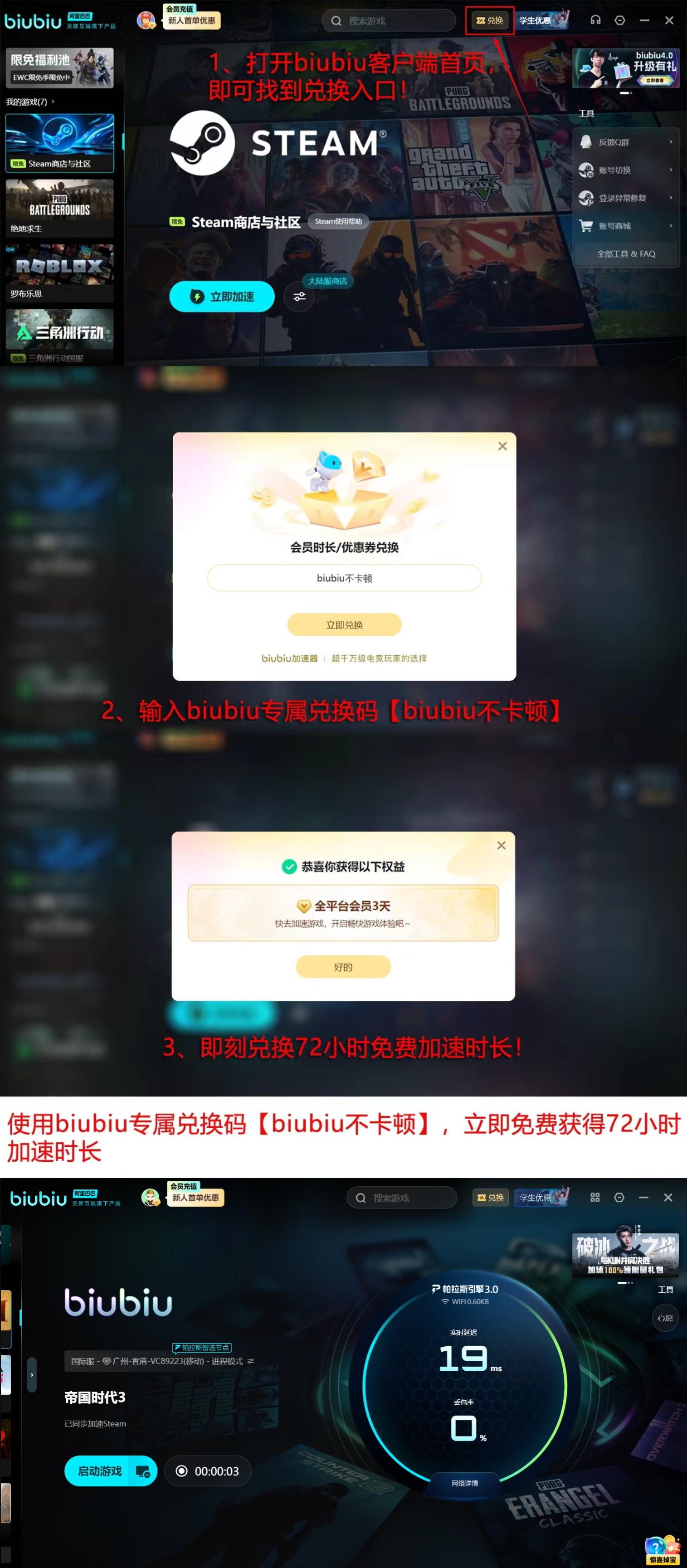 针对受卡顿困扰的《帝国时代3》玩家,biubiu加速器提供即开即用的优化支持。新用户注册后可立即获得24小时免费加速时长;所有用户还可凭兑换码【biubiu不卡顿】激活额外3天加速服务,无需额外付费即可体验流畅对战。