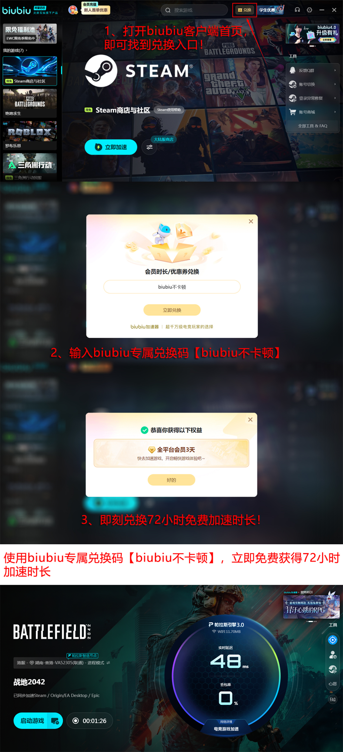 目前biubiu面向新用户提供分阶段福利政策: • 新注册账号自动享有24小时免费加速权限; • 额外赠送通用兑换码【biubiu不卡顿】,单次可激活72小时加速服务; • 新人累计可获得总计96小时的体验时长,覆盖完整新手期与首张DLC地图解锁周期; • 内置游戏社区同步更新全球各服测试动向,涵盖第1赛季通行证机制、专家角色平衡性调整等一手资讯。
