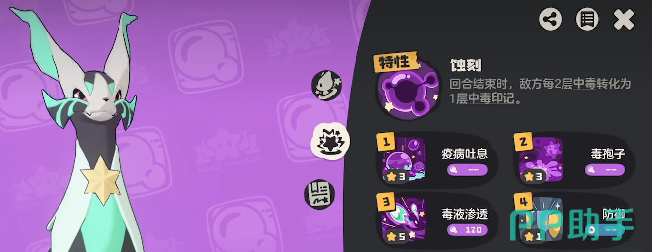 队伍核心输出位为厉毒修萝,需配置加速性格并确保个体值全满,以保障其在多数对局中获得先手权。技能组合固定为三连破、连续毒针及毒袍子——其中毒袍子可配合其特性,在单回合内叠加两层毒印记,并于回合结束时触发额外伤害。