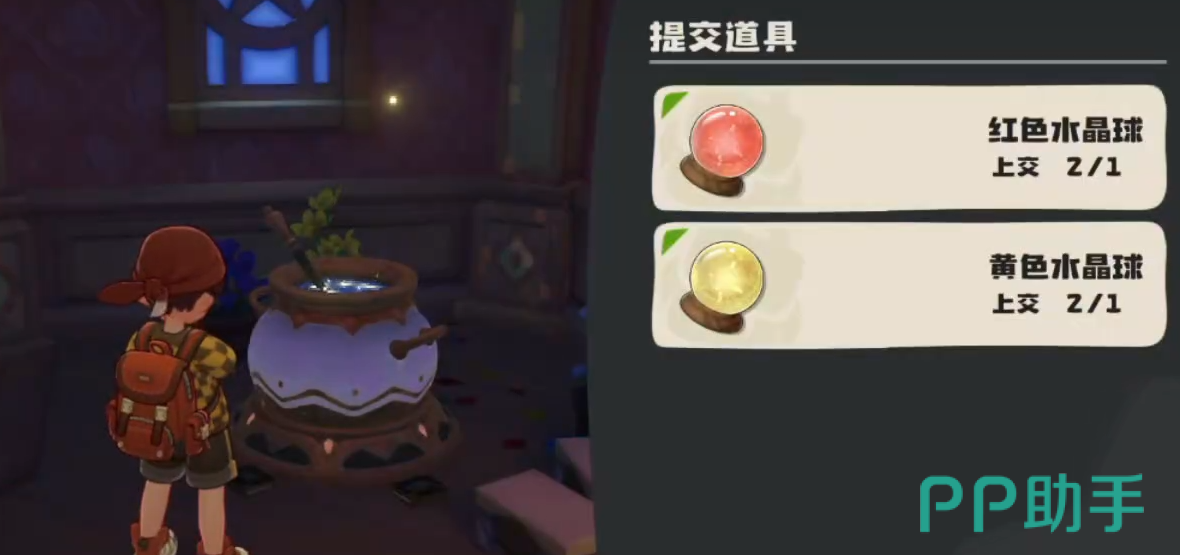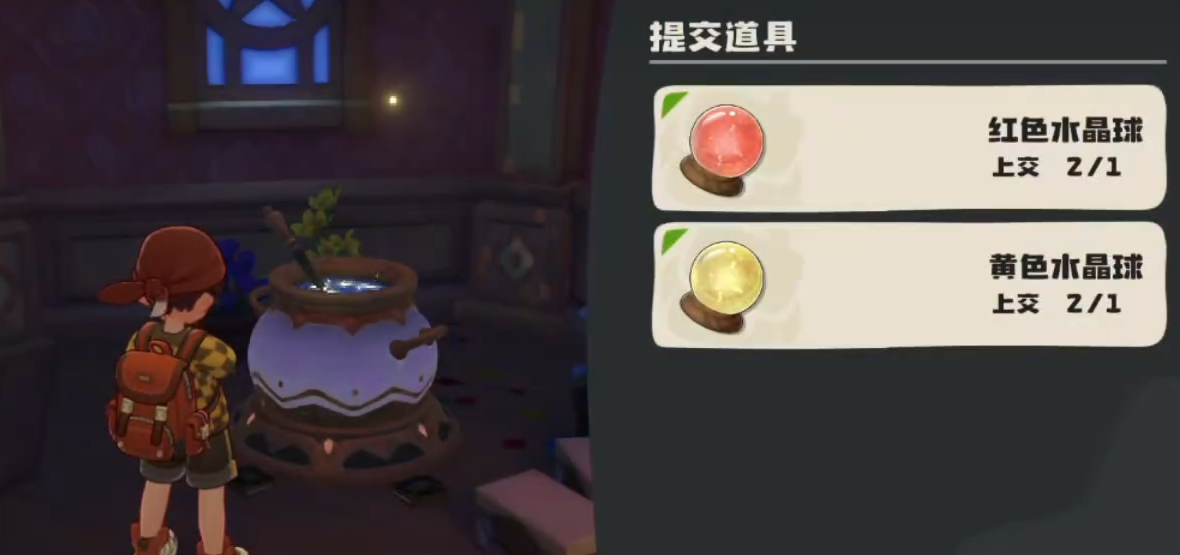 第三步:进入秘境后,正前方陈列一座古旧书架。书架各层共藏有6枚基础水晶球:蓝色×2、红色×2、黄色×2。全部拾取完毕后,前往场景内炼制台进行合成操作,可产出三枚高阶结晶——紫色×1、橙色×1、绿色×1。