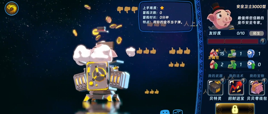 第四位为安全卫士,远程物理系代表,仅需消耗草莓道具即可解锁。战斗中可直接使用金币作为弹药,机制新颖且资源循环顺畅;虽无复杂连招,但基础伤害扎实,属于即用即强的实用型免费角色。第五位卡皮巴拉,掌握星界法术体系,法术范围与爆发特性突出,为队伍提供差异化输出维度。