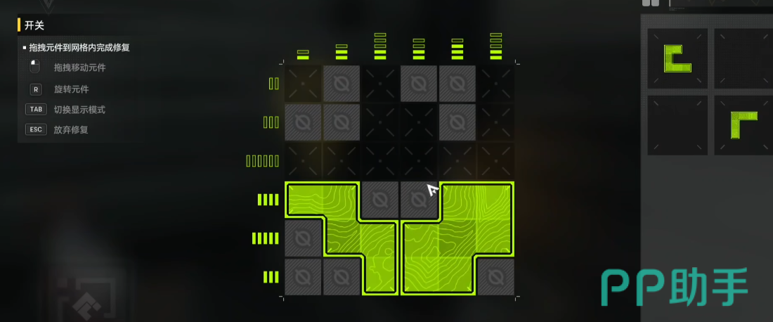 地图中散落着多台动力中断的机械单位,玩家靠近后可启动交互界面。维修过程采用动态拼合机制:以经典俄罗斯方块逻辑为底层设计,要求玩家将不同形态的几何模块精准嵌入指定网格区域。每个维修面板均设有方位约束条件——例如上侧需填满3格、右侧需覆盖2列等,玩家可通过旋转、平移操作调整方块朝向与位置,直至满足全部空间约束。