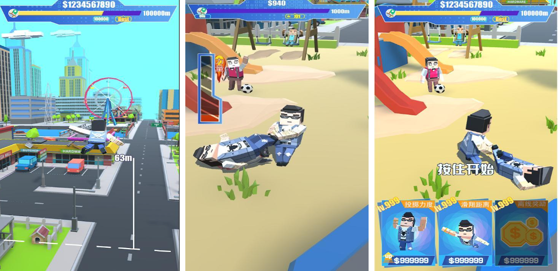 这是款玩法相当无厘头搞笑的竖屏抽象投掷游戏,游戏里的投资目标是一个个像素立体小人儿,投掷类的玩法互动性极高又有着很快节奏,蓄力旋转投掷的游戏概念给人一种特殊的快感,将角色投掷出去并降落到专属位置还可以获得积分,简单的长按蓄力操作也让游戏的进度更快,可消耗金币获取皮肤道具给角色切换。