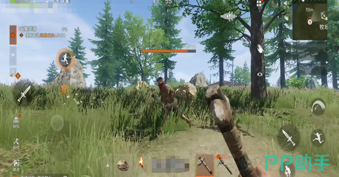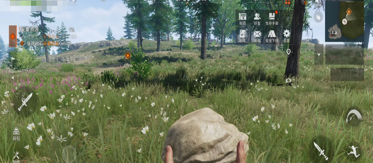 这款游戏刚开局的时候,玩家是没有任何装备的,生存的第一步需要收集若干基础资源,我们可以用拳头敲击树木用来获取木材,记得瞄准树上的红点,收集效率会更高。等待有一天经验足够就能制造出石锤。这个时候我们砍树就会事半功倍啦,另外后期可以开采矿石。各种石头可以制作强有力的武器。更能搭建坚固的庇护所。