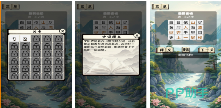 喜欢玩那种诗词歌赋主题手游的学生党可以试试看,这是款带有休闲益智气氛的猜猜乐游戏,根据上下文提示猜谜的游戏机制很有代入感,各种诗词歌赋纷至沓来让大家了解了古代诗人的眼界,水彩画的背景刻画意境十足,古风音律的BGM跟诗词类的玩法完美融合,诗词接龙主题的任务增加了大家的记忆力。