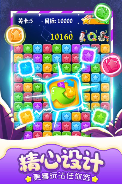 游戏给你设计了色彩艳丽的诸多星星,你只需要找到3个以上黏连在一起的星星,指尖双击其中任何一个星星,就可以消除它们,这为锻炼提升你的注意力、观察力起到毋庸置疑的裨益,你可以纵享点点消的快感。游戏有pk玩法,你能和好友比比消除实力,友情也得以增长。