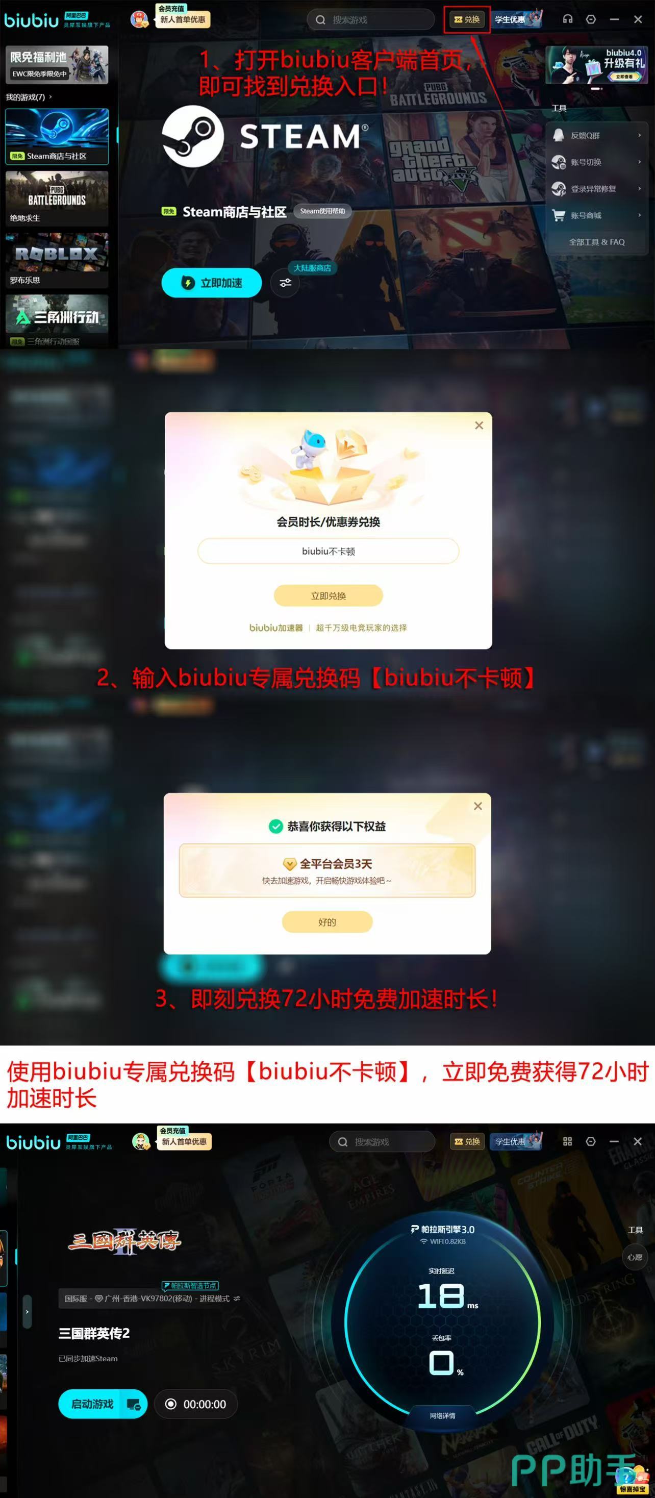 当前biubiu加速器正开展限时福利活动:新注册用户可即时领取24小时免费加速时长;同步开放【biubiu不卡顿】兑换码通道,所有用户均可凭码兑换3天额外加速权益。综合计算,首次使用的玩家最高可享96小时连续加速服务。试用期结束后,学生群体可通过认证享受专属折扣,首充用户亦享有阶梯返利政策,尤其适合需要稳定联机体验的玩家长期使用。
