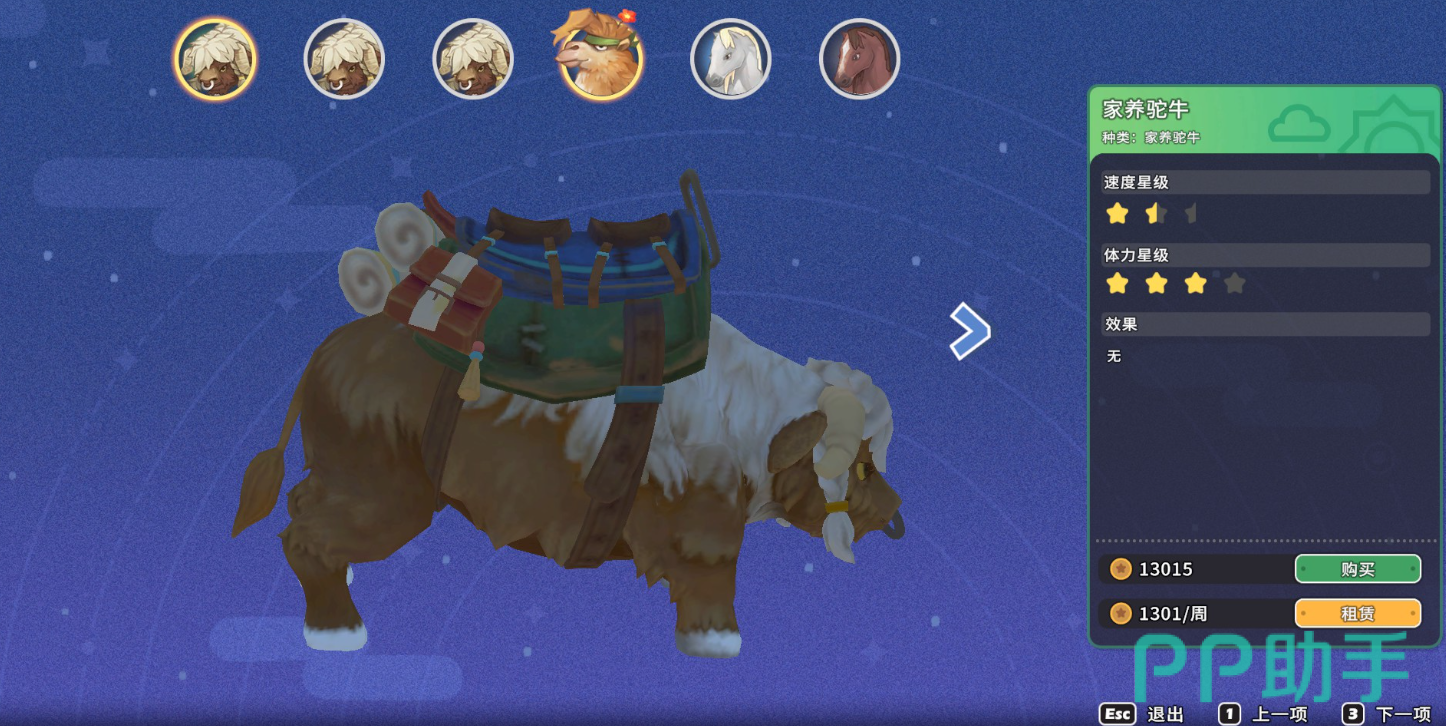 而家养驼牛则服务于另一类典型需求:大规模资源调度与持续性野外作业。其突出优势在于超高物品携带上限与充沛体力储备,单次出行可承载远超其他坐骑的采集物或建造材料,大幅降低往返频次;同时,长续航能力使其适用于长时间驻留采集点、跨日连续作业等场景,特别适配以基建扩张、农场扩建、工坊量产为核心的中后期建设流派。若玩家计划长期投入于地块开发、批量合成或远距离资源整合,家养驼牛将成为稳定高效的后勤支柱。