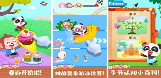 让所有小朋友详细了解春夏秋冬,一年四季不同的场景和相应的自然景观,各种天气特征和相应的代表性活动都会出现,比如秋天有金黄色的麦田,每当到了夏季,便会来到海边的沙滩上玩耍,春季拥有鲜艳的花朵,而冬季却拥有白雪皑皑的雪景,让小朋友详细了解季节的交替和相应的季节特点。