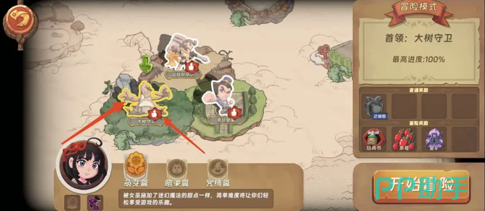 第一件前置道具为“神秘的果实”,其位置固定于“大树守卫”关卡场景内。值得注意的是,该果实无需击败守卫即可获取:玩家抵达该区域后,应忽略战斗提示,转而观察背景中一棵高大树木的枝干——果实正悬挂在显眼处,呈小巧圆润状。直接点击该果实,即可完成收集。
