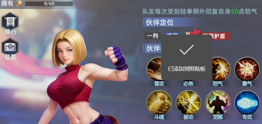 作为前排核心坦位,布鲁玛丽不依赖高额输出,而是通过稳定控场与持续增益构建队伍容错率。其被动技能可使全队其他角色每次发动普攻时,为其额外恢复50点怒气值,显著缩短技能循环周期。爆气机制设定为生命值低于50%时自动触发,立即恢复200点杀气,并生成相当于自身最大生命值20%的护盾——该机制兼具反制性与续战能力,是应对突发斩杀线的关键保障。