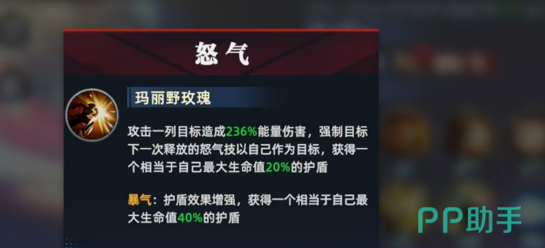 怒气技能作用于敌方一整列单位,造成能量伤害的同时施加强制目标锁定效果——令被命中的敌人下次释放怒气技能时,必须以布鲁玛丽为唯一攻击对象。该嘲讽机制有效分流敌方核心输出压力,配合技能释放后获得的20%最大生命值护盾(爆气状态下提升至40%),极大强化其承伤稳定性与站场持久性。