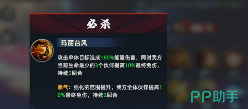必杀技为单体能量伤害,核心价值在于防御增益:常态下为当前生命比例最低的三名友方单位提供10%最终免伤;若在爆气状态下释放,则效果覆盖全体队友。这一特性使其成为对抗高频爆发敌人(如多段连击或AOE秒杀流)时不可或缺的战术支点。
