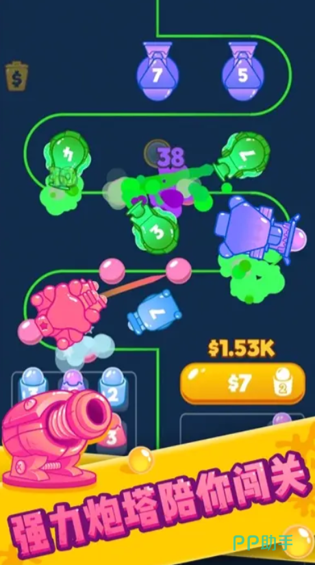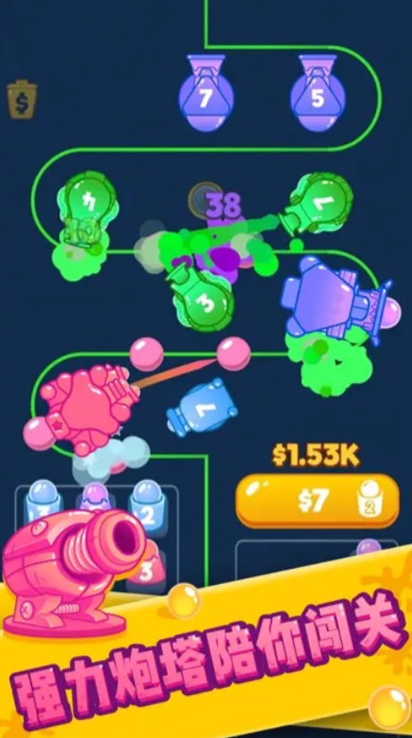 以颜料弹道为核心机制,不同颜色炮弹对应克制不同抗性敌人;相同色系炮弹可三连合成,生成高阶溅射弹体;支持在固定建筑表层自由涂鸦,实现个性化场景装饰与视觉反馈强化。