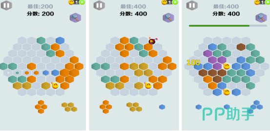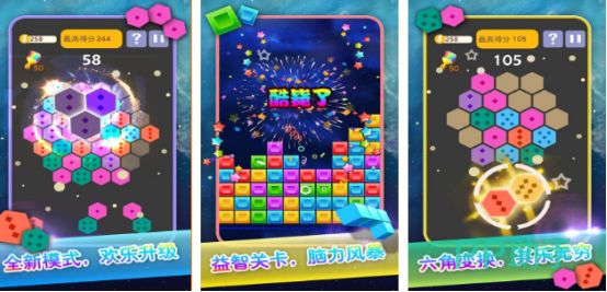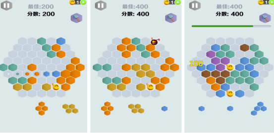 以六边形模块为核心载体,重构经典消除逻辑:玩家通过拖放操作将方块置入蜂巢格,达成区域填满、路径连接或边界围合等目标,部分关卡引入“领土占领”式成长机制;另设数字合成支线,沿袭2048核心规则,通过合并相同数值生成更高阶数字,最终达成指定合成目标。