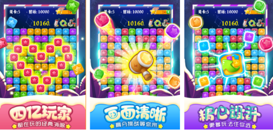 经典IP迭代版本,延续“同色点击即消”的极简操作逻辑,零门槛覆盖全年龄层用户。新增俄罗斯方块式下落拼接机制——玩家拖动星块至底部,组成完整行或列后触发批量消除;任务系统融入营救NPC等叙事要素,增强目标驱动性与剧情黏性。