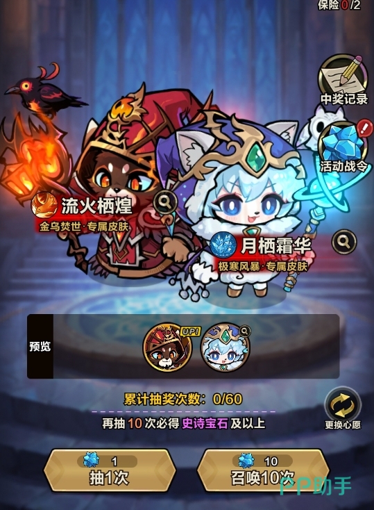 本次活动采用定向UP机制:每次抽取需消耗1枚蓝水晶(可通过战令任务获取,或以200钻石直接兑换),玩家可在开启前自主设定目标时装——即指定“月栖霜华”或“流火栖煌”为当期UP对象,从而显著提升对应时装的获取概率。系统内置保底规则:单个卡池内累计抽取达60次,必定获得所选UP时装;若额外启用“心愿保底”功能,则可确保第60抽必得目标时装,规避随机性风险。
