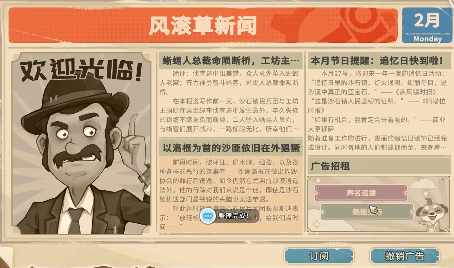 广告并非单纯增加曝光,而是直接作用于订单收益链的三重增益机制:其一为“财源广进”,使单笔订单结算金额翻倍;其二为“声明远播”,在完成新增订单后额外提升居民好感度;其三为“熟能生巧”,每日可承接订单上限由1单提升至2单。三项效果随机触发,每次发布仅生效一周,且每周一凌晨统一刷新,因此规划发布时间与订单交付节奏尤为关键。