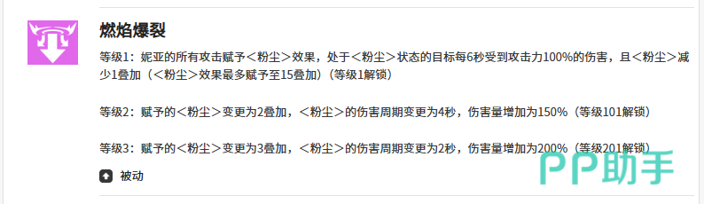 四技能【燃焰爆裂】是粉尘状态的奠基技能,命中后为目标施加粉尘,每秒造成100%攻击力的持续伤害。粉尘最多可叠加至4–5层,且层数衰减后能快速重置补满,构成妮亚整套循环运转的基础资源系统。