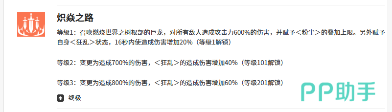 五技能【炽焱之路】提供高额单体爆发,伤害倍率为600%攻击力,并附带16秒狂乱状态,期间全队伤害提升20%。作为队长时,其支援效果可在6秒内每2秒触发一次600%烧伤伤害,形成稳定高频的DOT压制,进一步放大团队整体燃烧系收益。