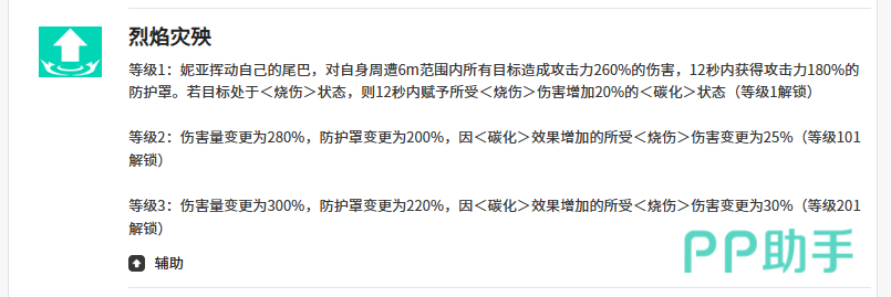 三技能【烈焰灾殃】为近身防御型技能,作用范围限于自身6米内,造成260%攻击力伤害,并生成持续12秒、数值相当于180%攻击力的护盾。若命中带有烧伤状态的目标,将额外赋予12秒碳化效果,使后续烧伤伤害提升20%,大幅强化持续伤害链。