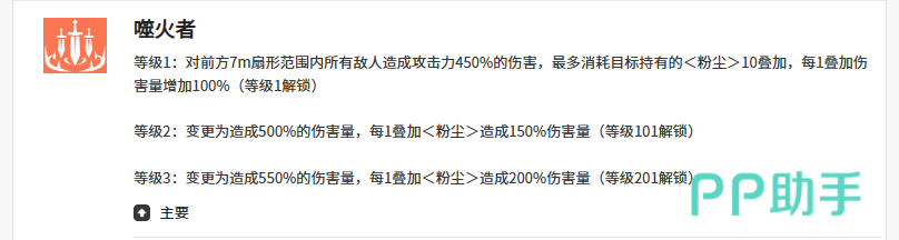 二技能【噬火者】为扇形突进技,作用半径约7米,基础伤害为40%攻击力。关键在于粉尘层数转化:每层粉尘可使该技能伤害提升100%,满层时单次输出达550%攻击力。该技能不仅承担主要输出职责,更是快速叠层与调整站位的核心手段。