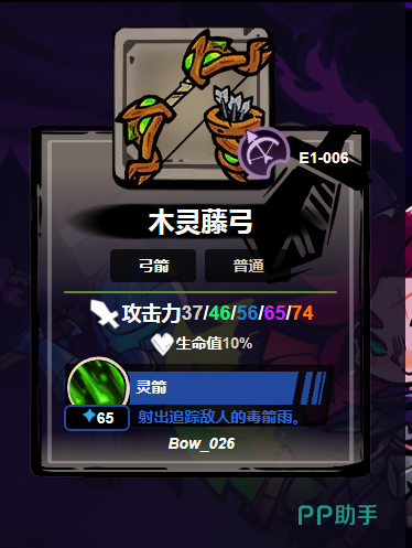 木灵藤弓:弓体缠绕鲜活翠绿藤蔓,整体造型富有自然律动。基础攻击力为37点,同步提供10%最大生命值加成,强化角色持续作战能力。其主动技能“灵箭”具备自动索敌功能,箭矢离弦后可实时追踪移动目标,对高机动单位(如蝙蝠、狼人)具备极强压制力;命中后附加持续毒素伤害,进一步扩大输出窗口。此弓适合偏好风筝战术与生存优先的玩家。