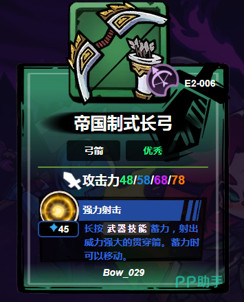 帝国制式长弓:定位为高阶远程主力装备,初始攻击力达48点,为当前弓系最高。搭载“强力射击”蓄力机制:长按攻击键积攒金色能量,松手瞬间释放穿透箭,可贯穿前排单位直击后排脆弱目标(如法师、召唤师)。该弓在Boss战中优势明显,尤其适用于应对大型首领——既能维持安全输出距离,又能在关键阶段打出集中爆发伤害,是高难度内容通关的重要保障。