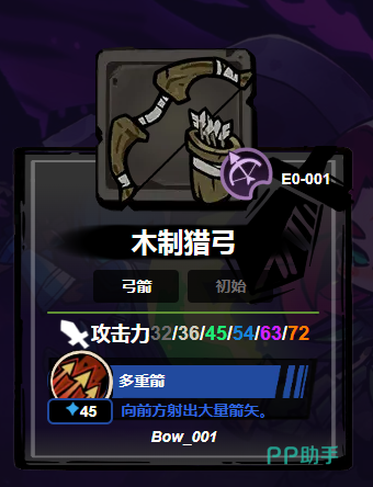 木制猎弓:游戏初期默认解锁的基础弓,外观呈现未经雕琢的原木质感,保留清晰可见的树皮肌理。基础攻击力为32点,虽数值偏低,但自带“多重箭”被动效果——每次射击可同时发射三支箭矢,形成扇形覆盖打击。该特性使其在清理低血量群聚敌人(如哥布林小队、史莱姆集群)时具备极高效率,是新手熟悉弹道预判与节奏把控的理想入门装备。
