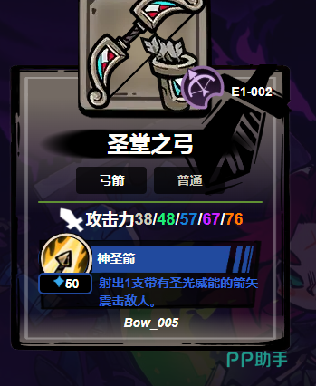 圣堂之弓:银白与赤红双色金属弓身交织,散发庄严气息。基础攻击力提升至38点,并附带核心技能“神圣箭”:射出的箭矢附加圣光属性,对亡灵单位造成额外伤害;命中目标后触发小范围爆炸,对周围敌人造成溅射伤害。该弓在对抗高防御目标(如重甲骑士、腐蚀型精英怪)时表现突出,单发即可瓦解其护甲结构,显著提升攻坚效率。
