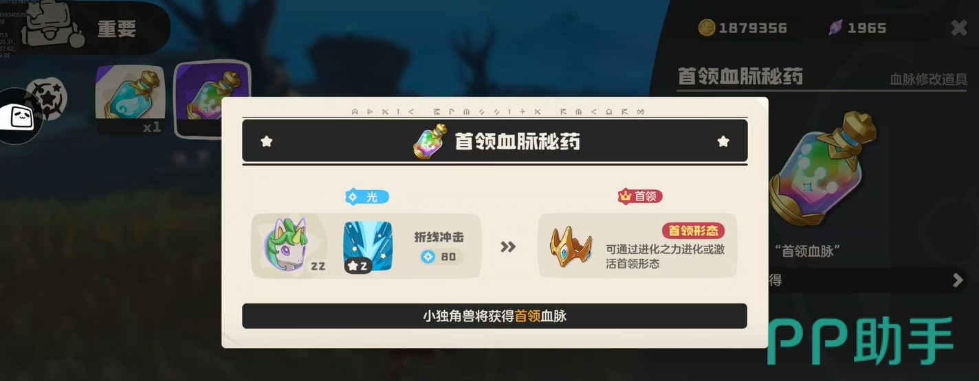 当白金独角兽同时拥有了进化之力和首领血脉之后,就可以进行进化操作了。不过这里有个细节要注意,在准备让它上场战斗之前,要先检查一下精灵背包里面的强化术设置。原本可能装备了其他的强化术,这时候需要把它替换成进化之力。只有把强化术换成进化之力,在战斗中才能将进化的机制触发,再配合上首领血脉的效果,白金独角兽就可以完成向彩虹独角兽的转变了。