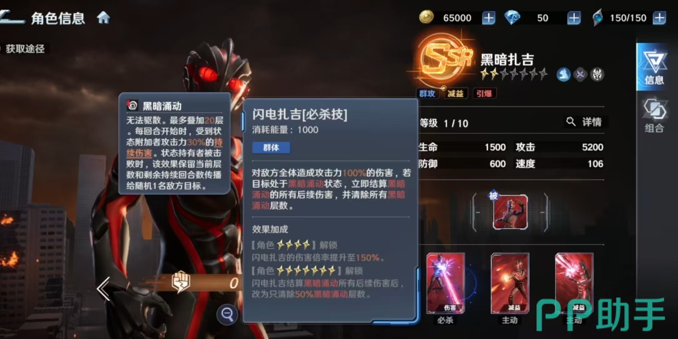 今天为大家深度解析《奥特曼:光之战士》中高人气SSR角色——黑暗扎吉(官方译名,非“黑暗扎古”)。该角色以黑红配色为主视觉,整体造型兼具压迫感与战术张力,在当前版本中稳居战力梯队顶端。作为核心输出兼减益型角色,其机制设计围绕“黑暗涌动”这一不可驱散的叠加状态展开,对战斗策略影响深远。游戏采用标准三段式技能结构:主动技、被动技与必杀技,各技能间存在高度协同逻辑,需系统理解方可发挥最大效能。