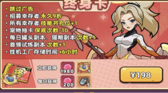 终身卡在游戏当中是需要一次性付费的,当成功付费之后就可以解锁很多永久的增益效果,比如付费成功之后,所有的功能都会立即生效,也会瞬间激活。就比如在玩游戏时,总是会有很多玩家受到广告的干扰,而终身卡却可以提供永久跳过广告,当弹出广告的时候就可以快速消除,提升了流畅度。其次还有就是资源获取的优化,比如有很多行程者都需要投入更多的金钱,才能够获得较高的道具,而当购买了终身卡之后就可以招募永久9折优惠,降低了角色的获取成本。