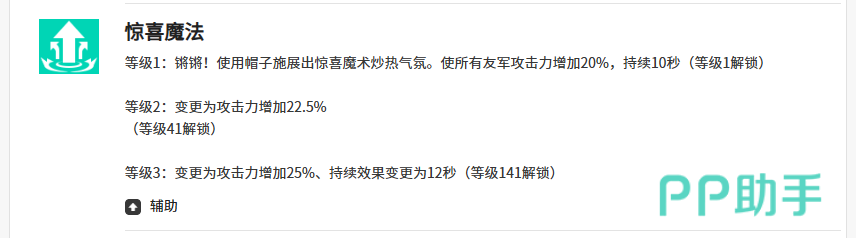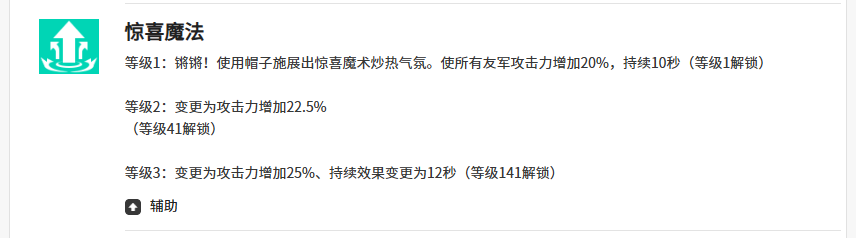 另外一个辅助技能叫做惊喜魔法,使用这个技能的时候,弗里姆会在当前对于友军作为目标的时候增加自身的20%攻击能力,后续的持续10秒时间之内都可以为周边范围之内的所有友军都带来20%的提升,所以对于如果我方角色在输出效果上面不太强势,又想要足够的真伤技能的时候,大家可以可以用这个惊喜魔法,而弗利姆对于被动能力来说比较突出的是花招百出,这个技能此时利用这个技能可以根据弗里姆的魔术效果,来直接扰乱敌人的视线,而且在场内他如果使用这个技能,对于所有的队友来说都是会有一定的增益可以使用,此时给到队友身上,就是如果对面暴击击中我方的话,那么此时我方队友身上受到暴击,其中的数值会减少20%,这样的减少能力给到队友的话,我方的生存能力同样是会有所提升,另外在所有队友身上的魔法暴击数值上面得到这个技能的增益加强,此时20%的提升效果之后,大家在其中也可以看到我方更有威力的输出效果。