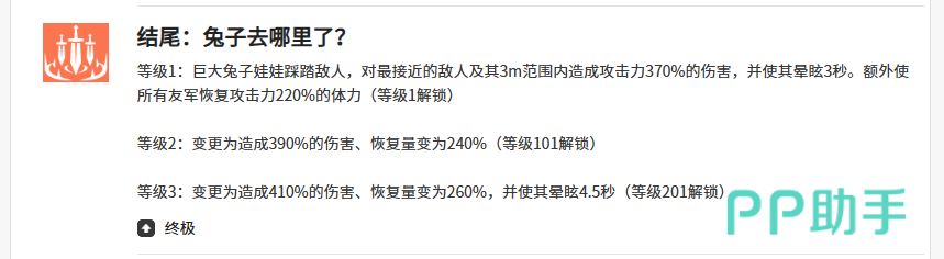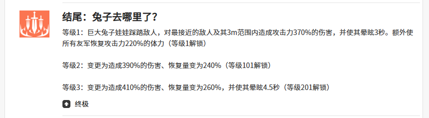 而另外弗里姆在结尾兔子去哪了这个终极大招上面可以召唤出来一个巨大的兔子娃娃,兔子娃娃当前会自动对敌人进行踩踏输出,而且对最接近弗里姆的敌人来说,只要是在她周边3米范围之内的敌人都可以造成攻击力上面370%的伤害,然后达成3秒眩晕之后,额外使所有友军在恢复体力上效果上面,得到弗里姆攻击数值当中220%的体力恢复,所以对于当前如果弗里姆攻击数值越高的情况下,根据她的大招给所有队友带来的体力回复自然会更多,最后在支援技能效果上面,会带来的技能是连续飞刺,这个技能可以根据当前的增益,给所有的队友带来恢复队长精灵攻击力当中250%的体力,而且如果此时队长精灵是同样走辅助,15秒之内所有的队友暴击概率以及速度加成上面都会有10%的增加,所以作为这样全面性的支援效果,大家很多的队友身上都是比较需要的。